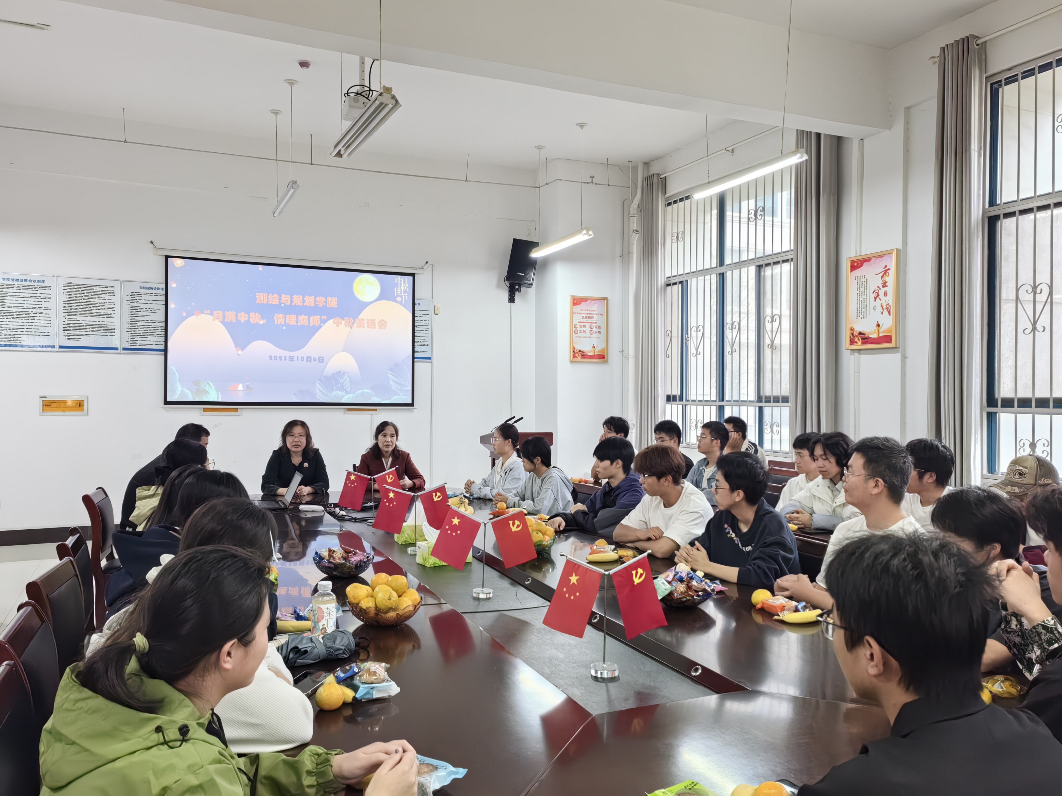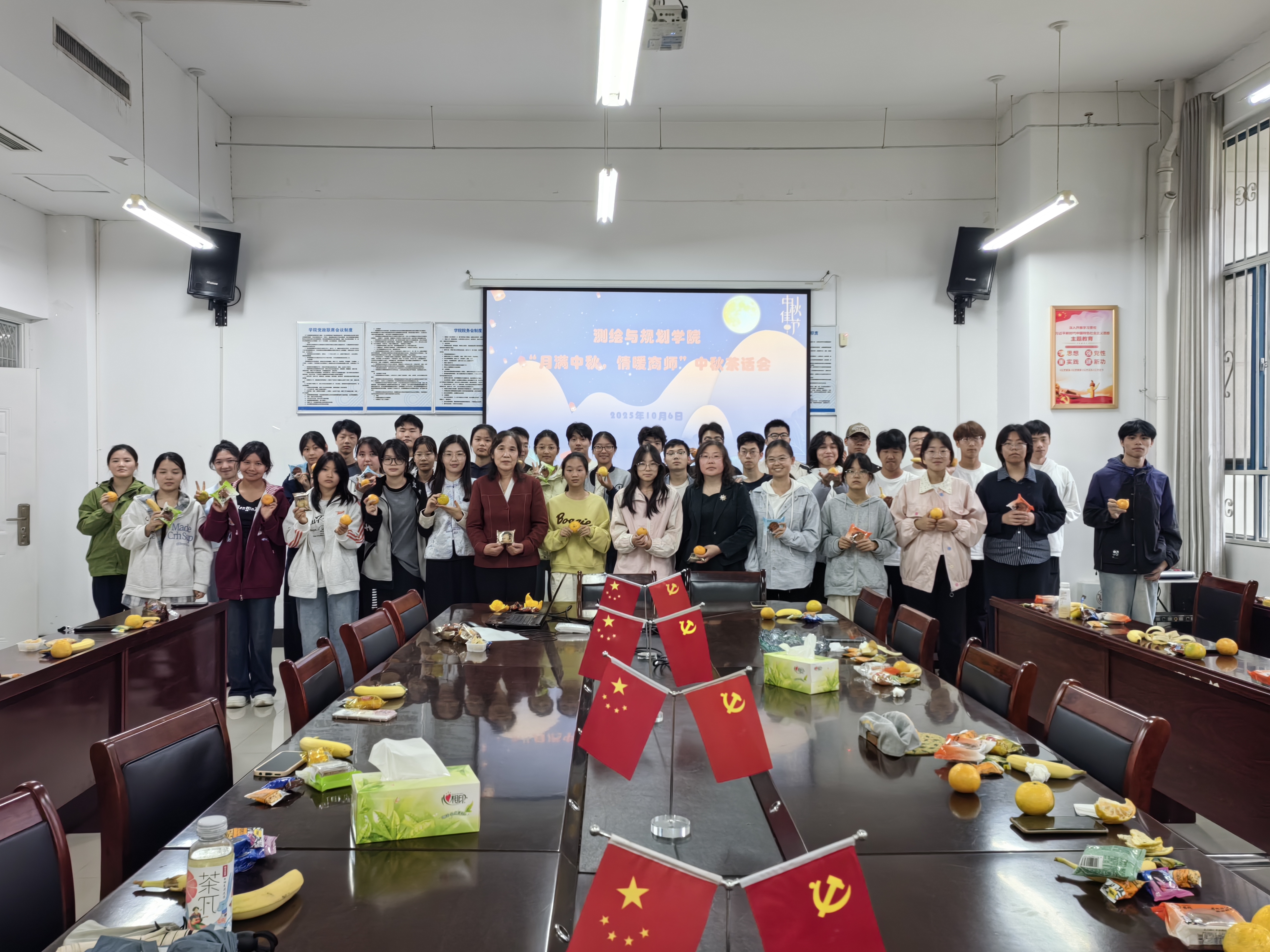10月6日,测绘与规划学院于三商楼134会议室举办“月满中秋,情暖商师”中秋茶话会。学院党委书记路利、党委副书记王丽、党政办主任魏理、学工办副主任兼2025级辅导员苏婉月及2025级留校新生欢聚一堂,共庆中秋,共话成长。