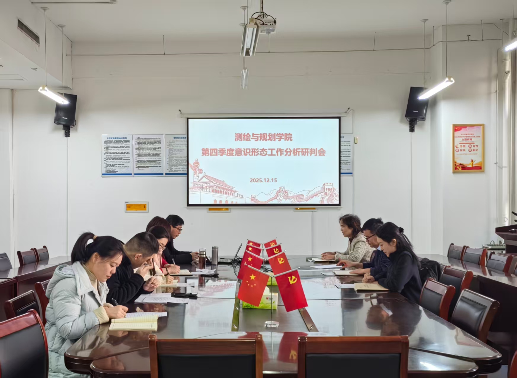 12月15日,测绘与规划学院在三商楼134会议室举行了2025年第四季度意识形态工作分析研判会,学院党委副书记王丽、副院长范况生、黄河故道生态研究保护中心主任朱新玉、科研助理吴方涛、全体辅导员参会。会议由王丽主持。