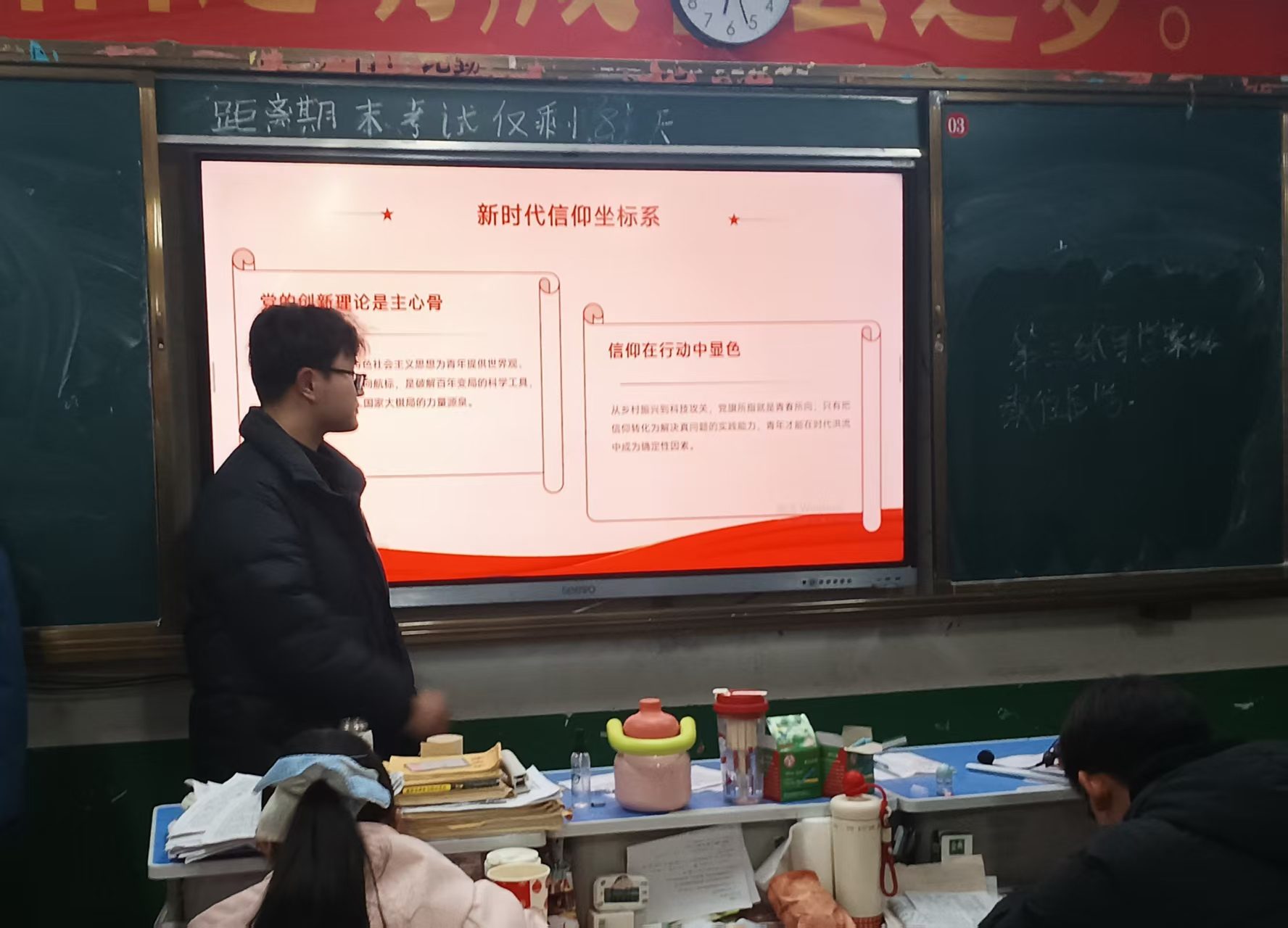 宣讲团成员张俊睿在驻马店市汝南县第一高级中学的课堂上以青言青语向学弟学妹们传递党的创新理论,在实践中锤炼本领、坚定信念,有效激发了青年投身“十五五”建设的责任感与使命感,达到了受教育、长才干、作贡献的活动成效。