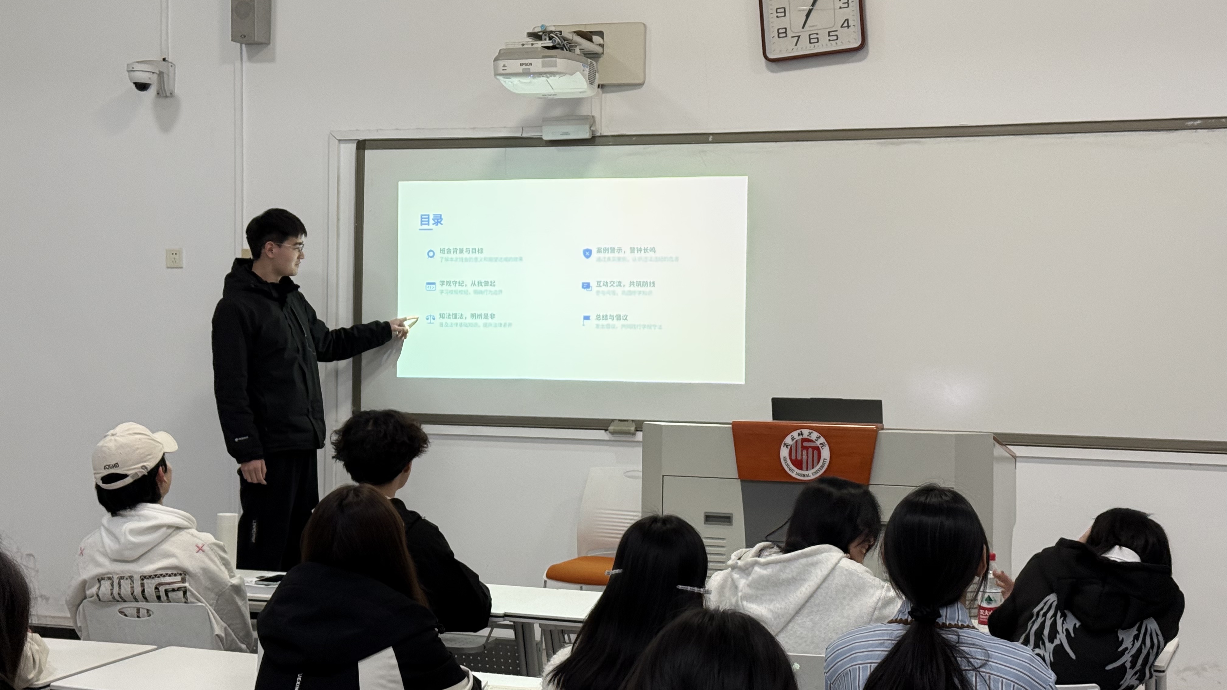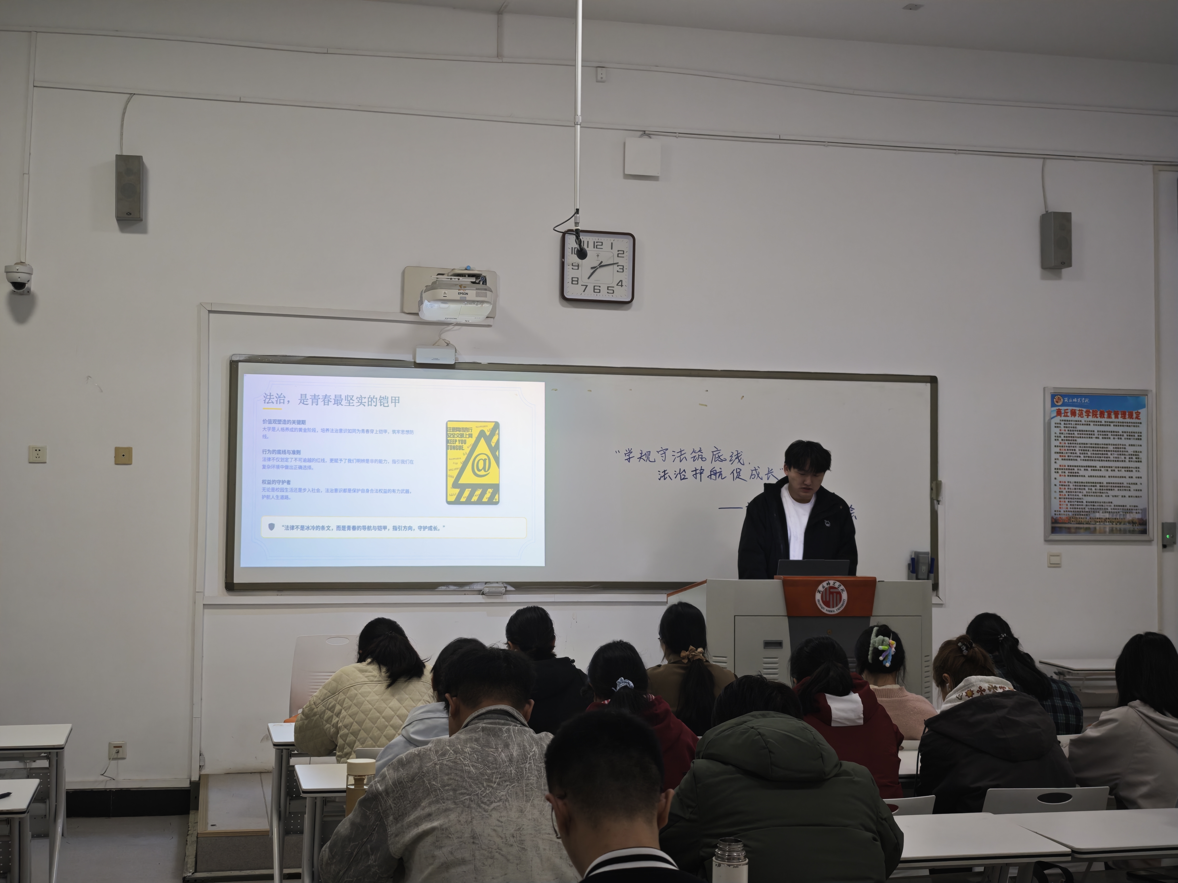 各班级通过知识讲解、案例剖析、互动讨论等形式,围绕国家法律法规、学校校规校纪,结合典型案例与生活场景,详细讲解了与青年学子息息相关的法律法规、校规校纪,让同学们深刻认识到法治与日常学习、生活密不可分。同学们纷纷表示,要自觉学习法律知识,严守校规校纪,主动抵制违法违规行为,做到知法于心、守法于行。
